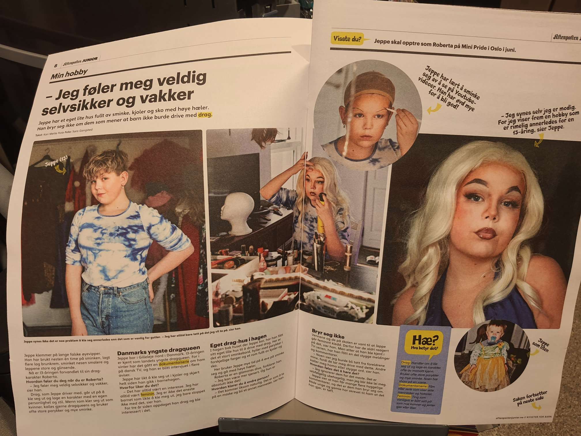 Leste i @Aftenposten Junior, som er en avis «spesielt skrevet for barn». Vel, hvorfor skal barn få at de kan bli dragqueens på forsida og med 3 sider inni, der de nå blir å søke på «dragmor» for å få innføring i sitt nye alterego av fremmede menn i kostymer? pic.twitter.com/kcqZGc8j24