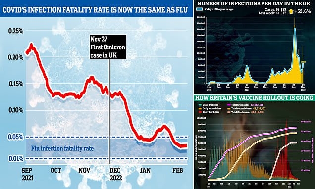 Analyse fra MailOnline sier at Covid er mindre dødelig enn influensa i Storbritannia. Det er to hovedårsaker til dette: den milde omicron-varianten og den allerede svært høye immunitetsraten.