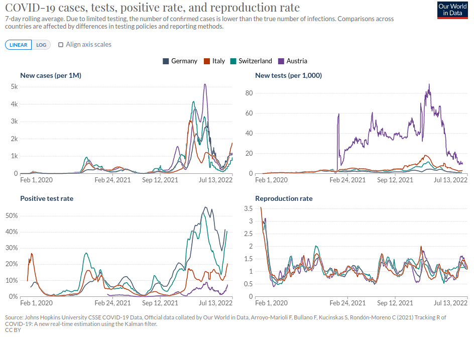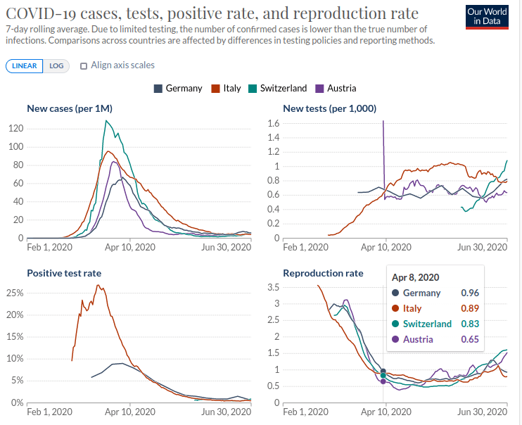 De andre parameterne falt også. I Italia toppet den positive testraten 20. mars, selv om antall tester fortsatte å øke. Enda verre for Team Lockdown, viser den tidlige pandemien, i den grad den tillater gjenoppbygging, en synkende trend i netto reproduksjonstall etter at det første tilfellet ble oppdaget i februar. Fra 8. april falt den under 1 i Østerrike, Sveits, Italia og Tyskland, noen ganger til og med svært betydelig. Hvis den er under 1, fases bølgen ut, ettersom infiserte mennesker infiserer mindre enn ett annet menneske. Uansett, fra 15. mars gikk reproduksjonsraten ned overalt, og ingen av tiltakene som ble innført på den tiden var lenger berettiget.