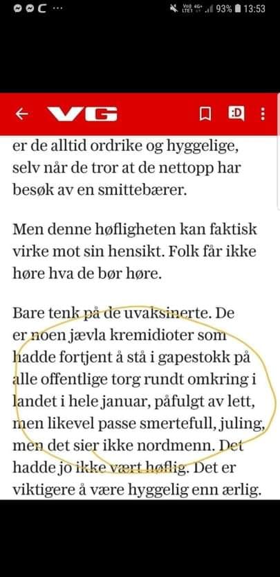 Folket eller skal vi si sauene, svelger den tafatte argumentasjonen om at det er de «uvaksinerte» som gjør at vaksinen ikke virker hos de «vaksinerte», og har lykkes i sin bestrebelse med å skape både segregering og stigmatisering av folket… alla Nazityskland fra 1933. Mediene har her et stort ansvar for denne segregeringsprosessen som nå er i gang – og må stilles til ansvar når regnskapet skal gjøres opp, sammen med myndighetene. Her er hva VG presterer å slippe til av skribenter som Sanna Sarromaa, og publiserte den 31.12.2021: