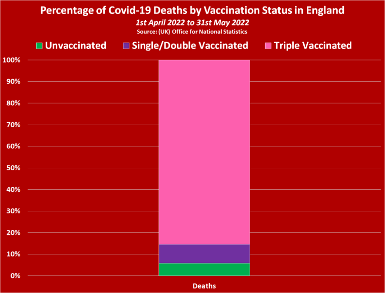 De siste tallene analysert viser at sjokkerende 94 % av alle Covid-19-dødsfall i april og mai var blant den vaksinerte befolkningen i England, og 90 % av disse dødsfallene var blant den trippel-/firedobbelt vaksinerte befolkningen.