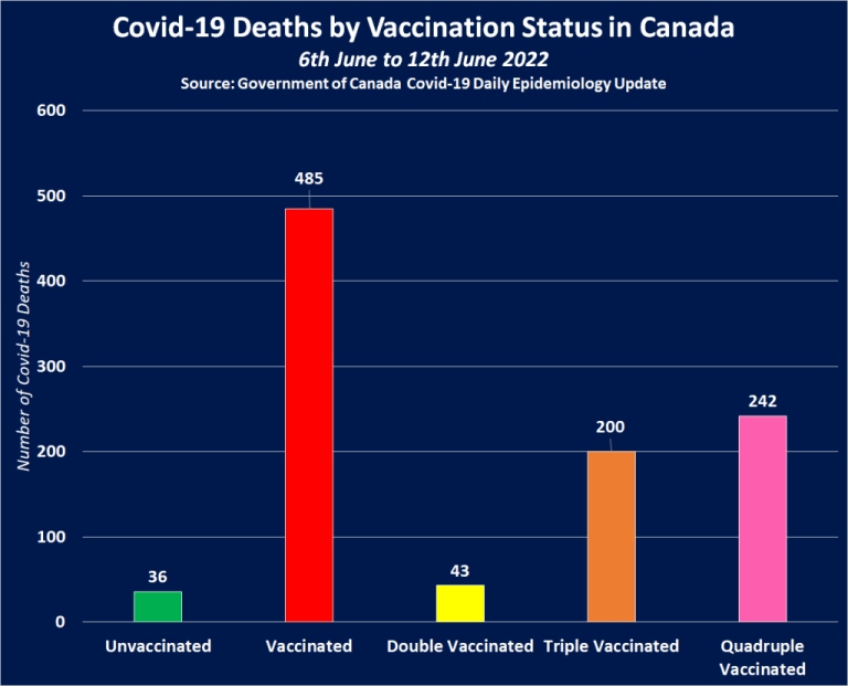 De siste kanadiske regjeringstallene viser at det var 521 Covid-19-dødsfall mellom 6. juni og 12. juni, hvorav 485 var blant den vaksinerte befolkningen, med sjokkerende 242 dødsfall blant den firedoble vaksinerte befolkningen, noe som betyr at de utgjorde 50 % av Covid-19 dødsfall blant de vaksinerte i den andre uken i juni 2022.