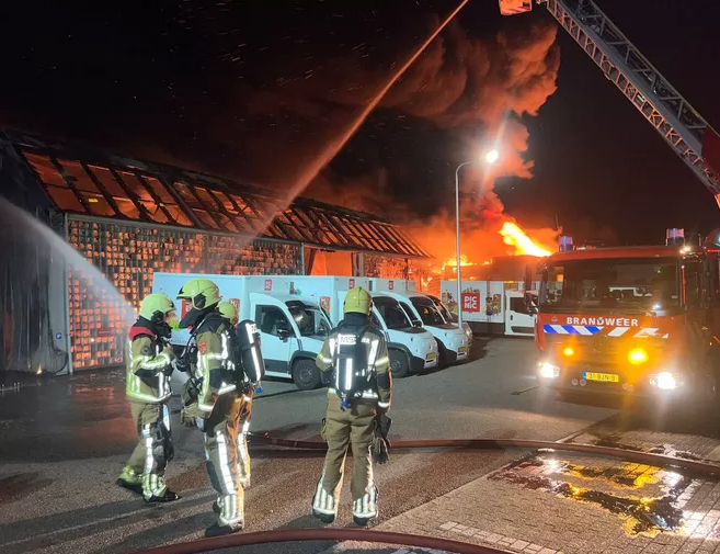 Flere brannvesen i Almelo har kjempet mot flammene i timevis: Det enorme distribusjonssenteret til den nettbaserte supermarkedskjeden “Picnic” vil sannsynligvis brenne ned fullstendig, de første videoene viser et enormt omfang av skader.