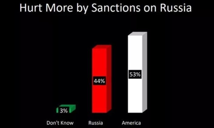 53 % av respondentene i Democracy Institute/Express-undersøkelsen mente at sanksjonene ment å ramme Russland faktisk skader USA mer, og 63 % tror nå at Biden ikke vil bli gjenvalgt i 2024.