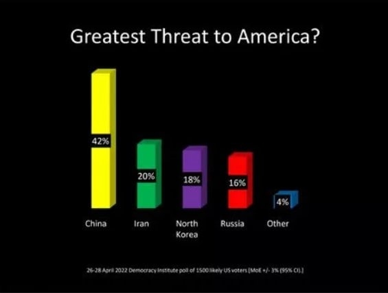 Russland blir bare sett på som den fjerde største trusselen mot USA bak Kina (42 %), Iran (20 %) og Nord-Korea (18 %).