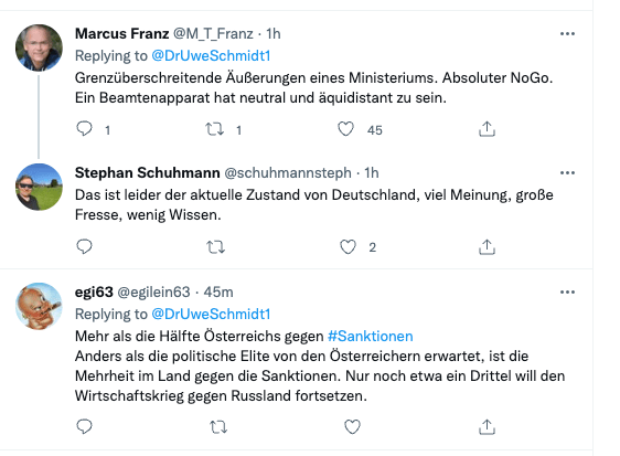 Det er et «grenseoverskridende utsagn», for andre rett og slett «galskap» – alle er enige om at meningsdiktaturet dermed har nådd et nytt lavpunkt. I en offisiell tweet fra Robert Habecks, Tysklands visekansler og leder for grønne departement for økonomi og klimabeskyttelse blir det nå dømt hvem som er et «Putin-troll».