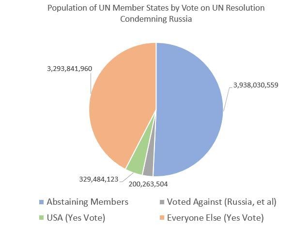 Faktisk inneholder statene som enten avsto fra å stemme i FN-avstemningen eller stemte imot, mer enn halvparten – 53 % – av verdens befolkning. Blant avholdsstatene er Kina og trettitre andre stater som til sammen har opptil mer enn 3,9 milliarder av verdens 7,7 milliarder mennesker. Å kombinere nei-velgerne med de avholdende statene legger ytterligere to hundre millioner mennesker til alliansen av stater som nekter å fordømme Ukraina-invasjonen.