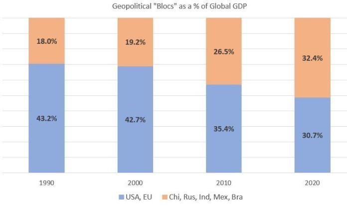 Så, hvilken del av den globale økonomien vil sannsynligvis opprettholde bånd med Moskva i løpet av denne antatte isolasjonsperioden USA og EU har påført Russland? Ser vi på et begrenset utvalg av sanksjonsmotstandere – dvs. Russland, India, Kina, Brasil og Mexico – finner vi at denne “alliansen” til sammen utgjør en hel tredjedel av globalt BNP (Kina og India utgjør selvfølgelig det meste av dette ). Det ligner på de kombinerte økonomiene i USA og EU.