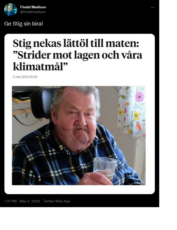 Sverige: Etter et langt og arbeidsomt liv synes Stig Lindgren ved Framnäs eldrehjem i Fors at han i det minste har fortjent en lettøl til maten. Men fra kommunens side kommer det et skarpt nei. Hvorfor? Fordi de mener en lettøl til maten til Stig på hverdagene strider med loven og…..wait for it….klimamålene.
