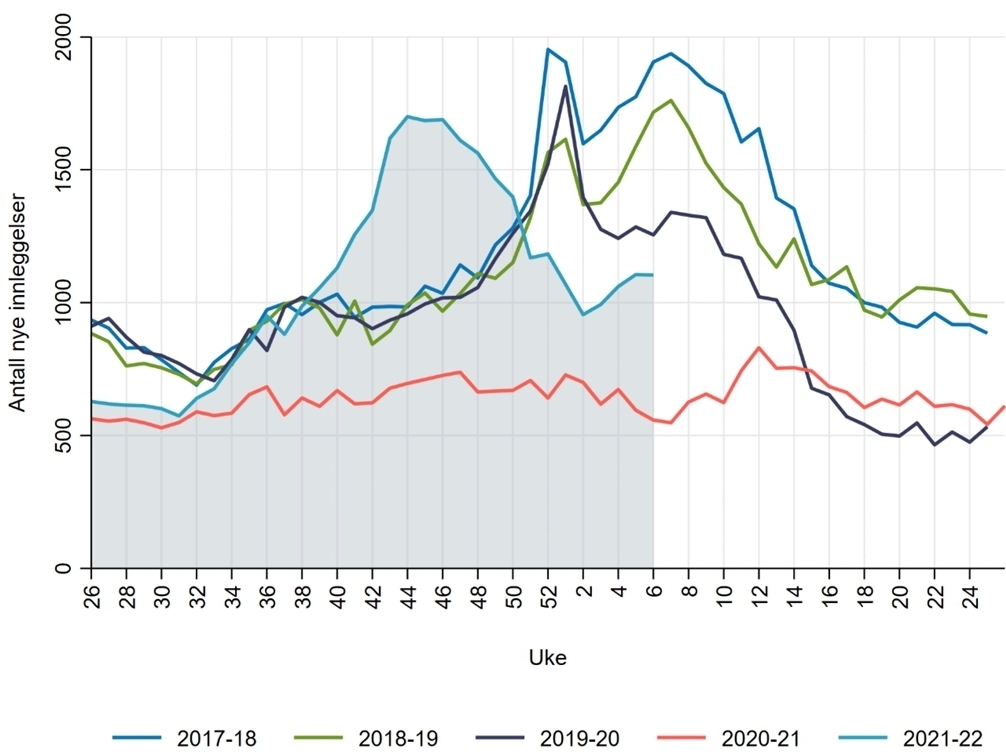 Antall nye innleggelser i sykehus med luftveisinfeksjon per uke, etter sesong, 26. juni 2017–13. februar 2022. Kilde: Beredt C19 med data fra Norsk pasientregister.