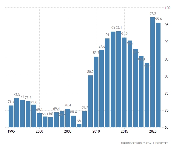 Men det er ikke alt. Det høye gjeldsnivået i eurosonen er ikke helt 100 prosent av BNP – hvis du ekskluderer Tyskland er det godt over 100 prosent. “Dette uttømmer også i stor grad muligheten for finanspolitiske tiltak.”